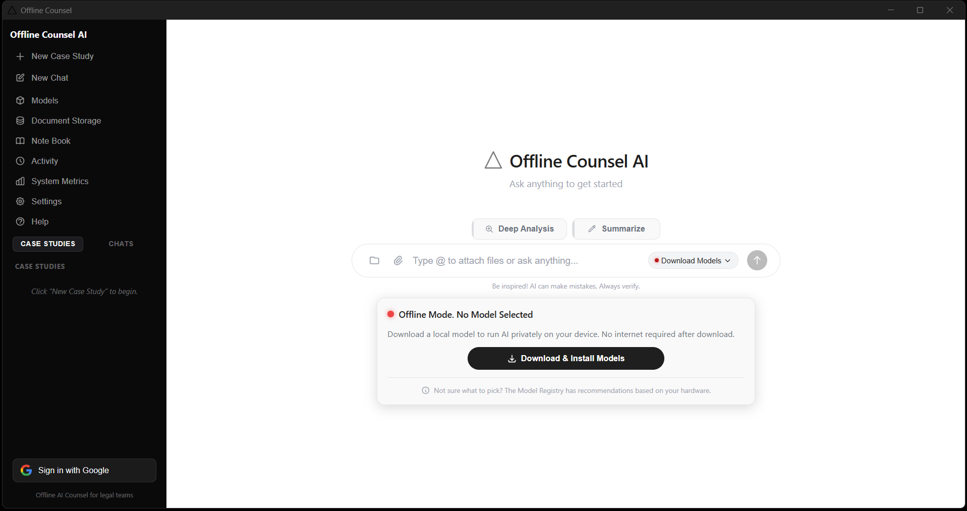 Our Chat Interface runs locally on Windows and lets users run Llama 4, DeepSeek, Mistral, Qwen, and other open models entirely on their own hardware, free forever. Our CLI, Terminal, and CLAW coding agent are in active development as free, open source tools for developer teams. Offline Counsel for legal teams and Offline Health for clinical environments are built and ready for paid pilot deployments.